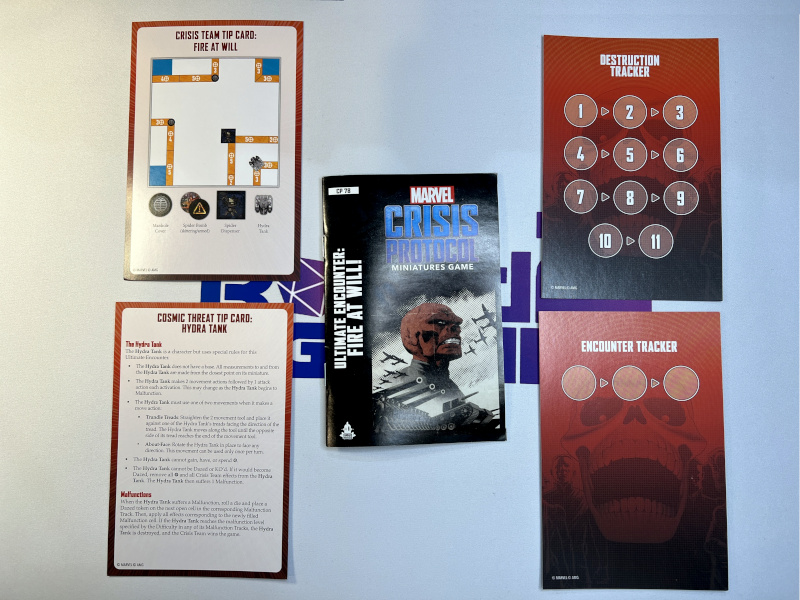 An instruction booklet for how to run the Ultimate Encounter: Fire At Will! is included. In addition, resources to run the scenario including scenario trackers, set up and rule reminder cards.