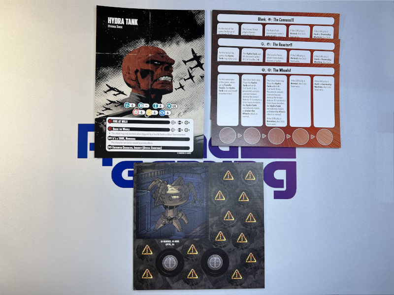 Of course, you will get the stat card for the Hydra Tank. During battle, the Hydra Tank will suffer malfunctions to its various parts. These are tracked using the included Malfunction cards. Lastly, cardboard tokens are included representing Spider Bomb minions in the scenario.